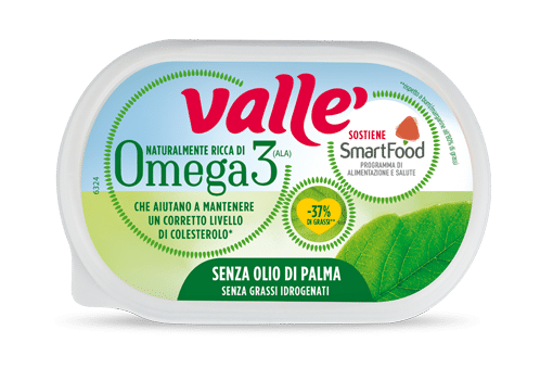 Vallé Omega3: più leggera e naturalmente ricca di Omega 3 (ALA) buoni per il colesterolo, grazie alle proprietà dei semi di lino, contribuisce a mantenere un corretto livello di colesterolo nel quadro di un’alimentazione varia ed equilibrata e di uno stile di vita sano.